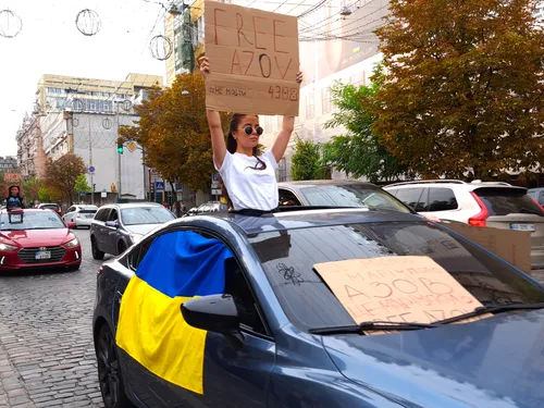 Oamenii se adună de o parte și de alta a bulevardului Bohdana Khmelnyts, aproape de intersecția cu bulevardul Khreschatyk, purtând bannere prin care solicită eliberarea luptătorilor din Regimentul Azov care au apărat orașul Mariupol, dar și a altor militari ucraineni aflați în captivitate.