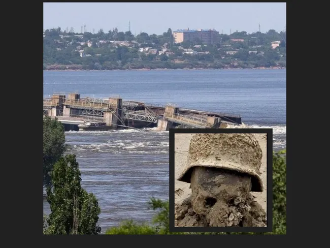 Videoclipurile realizate pe malurile ucrainene și rusești ale râului Nipru, unde se afla barajul de apă, arată cranii împrăștiate în nămol, unul dintre ele purtând o cască din al doilea război mondial. Imaginile nu au putut fi verificate în mod independent din cauza luptelor din zonă, arată Guardian.