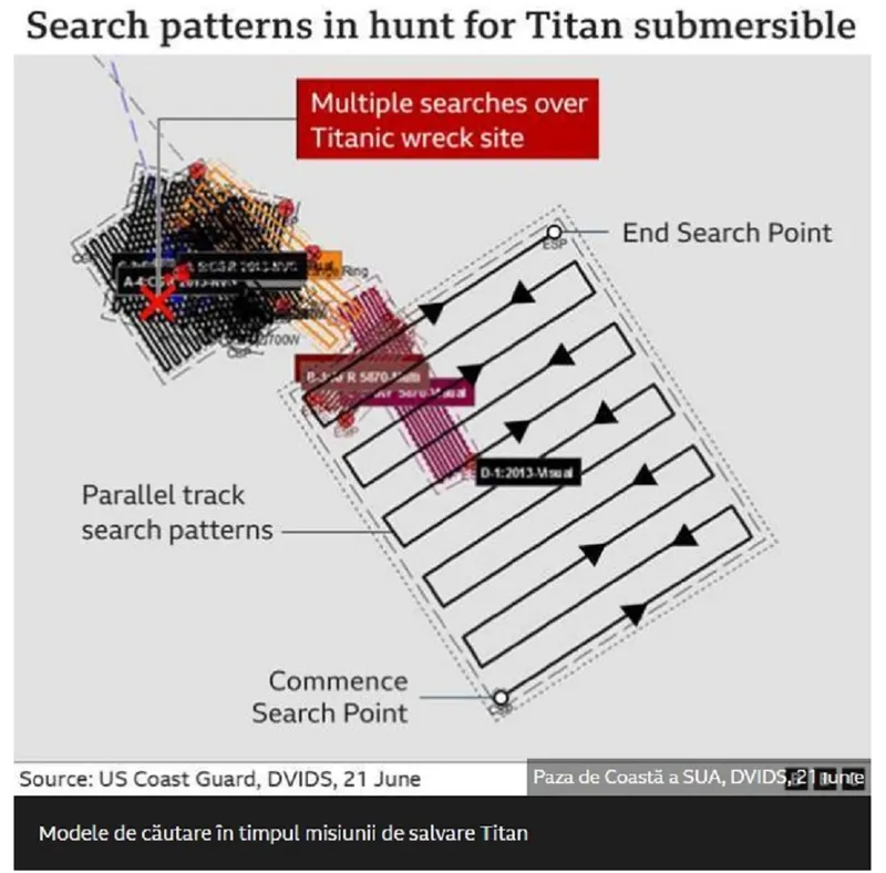 Un grafic publicat de Garda de Coastă a SUA arată modelele de căutare pe care echipele de salvare le-au acoperit în timp ce căutau Titanul la începutul săptămânii.
