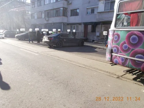 Cum justifică o șoferiță cu BMW că a blocat linia de tramvai: "Aveam programare la gene. Mă grăbeam"