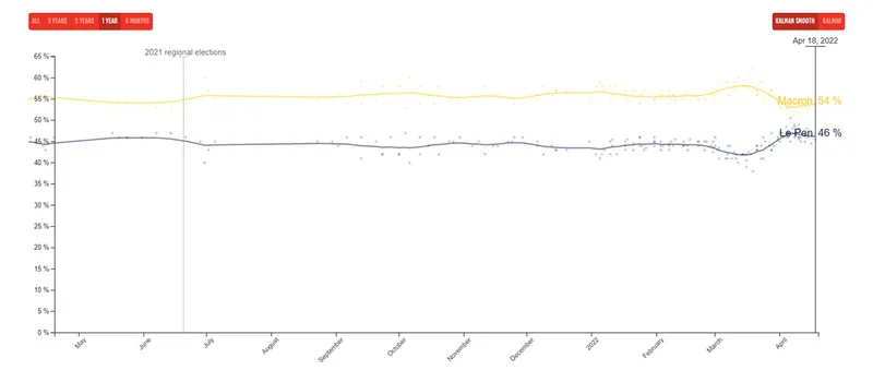 Președintele francez în exercițiu, Emmanuel Macron, ar câștiga cel de-al doilea tur de scrutin al alegerilor prezidențiale din Franța, din 24 aprilie, în fața rivalei sale de extremă dreapta cu un scor de 54% - 46%, potrivit unui ultim sondaj publicat pe 18 aprile de politico.eu.