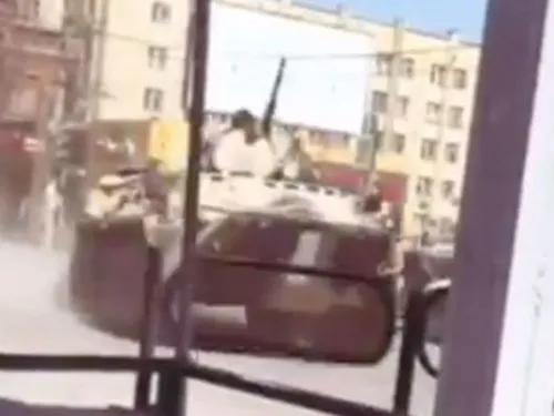 Un localnic din regiunea rusă Astrahan, la 563 de kilometri de graniță, a filmat vehiculele blindate BTR 80 cu dungi albe pictate pe ele.