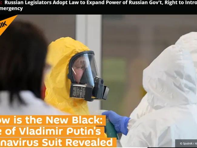 Publicația de propagandă a Rusiei, Sputnik, îl prezintă pe Putin, care purta un costum de maximă siguranță, ca pe un prezentator de modă care lansează o nouă linie, nu ca pe o persoană căreia îi este teamă să nu cumva să se infecteze cu un virus despre care spune, oficial, că nu e o problemă.