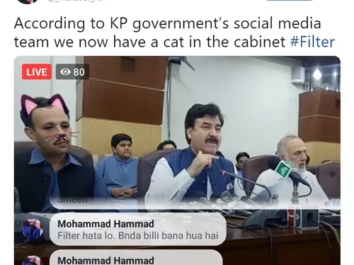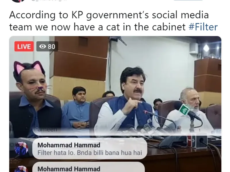 Guvernul provinciei Khyber Pakhtunkhwa din Pakistan a transmis live pe facebook o ședință cu filtrul "pisicuță" activat. Miniștrii au putut fi văzuți cu urechi roz și mustăți spre deliciul celor care-i urmăreau.