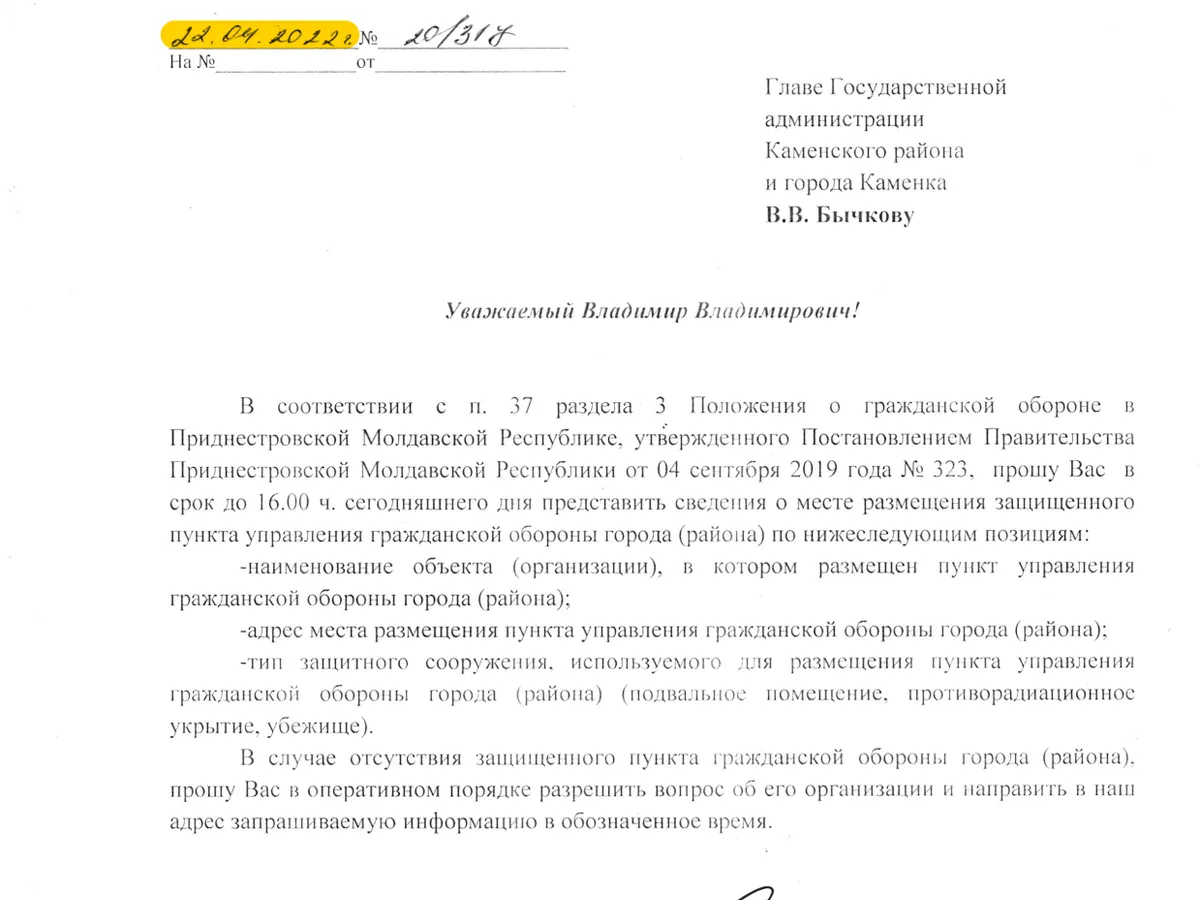 Evenimentul nu a luat prin surprindere conducerea Transnistriei. Pe 22 aprilie, Vadim Shmalenko, secretarul Comisiei de Stat pentru Situații de Urgență a Regiunii Transnistrene, a trimis o scrisoare șefului districtului Kamensky, Volodimir Bychkov. Epistola se referea la pregătirea urgentă (până la ora 16.00 în aceeași zi) a tuturor informațiilor privind disponibilitatea și crearea urgentă a unui adăpost de de apărare civilă în oraș. Erau solicitate denumirea obiectivului, adresa și tipul structurii de protecție (vezi document).