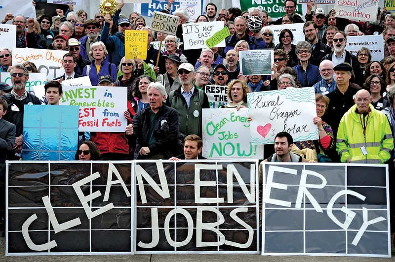 LOCURI DE MUNCĂ AFECTATE Ecologiștii cer crearea de locuri de muncă în sectorul energiei curate la un miting din martie 2017 în Salem, Oregon. Stimulentele din legislația din 2022 au impulsionat sectorul