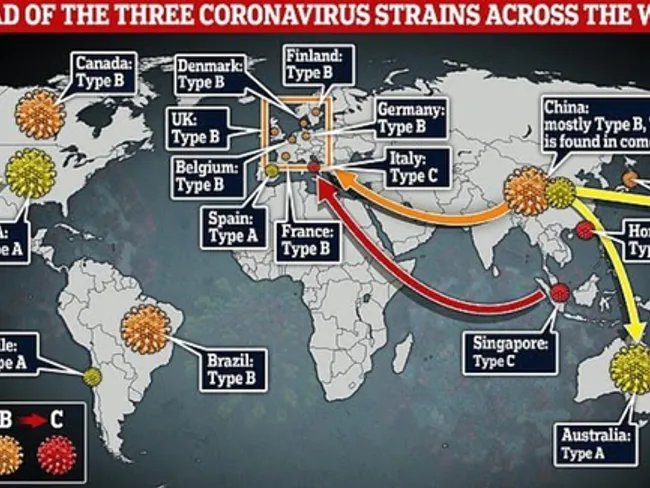 Există trei tipuri de virus - A, B şi C. Tipul A este cel mai apropiat de coronavirusul descoperit la lilieci şi ar fi genomul de origine al virusului uman. Acest tip a fost descoperit la chinezi şi la americani, şi prezintă versiuni cu mutaţii la pacienţi din Australia şi Statele Unite. Însă tipul A nu a fost descoperit la majoritatea cazurilor din Wuhan, oraşul din China în care s-a descoperit pentru prima dată covid-19.