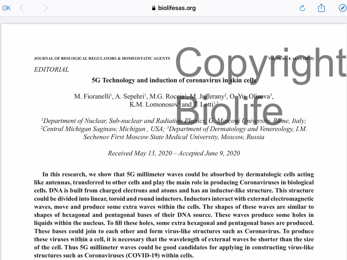 "În această cercetare, arătăm că undele milimetrice 5G ar putea fi absorbite de celulele dermatologice care acționează ca antene, transferate în alte celule și joacă rolul principal în producerea coronavirusurilor în celulele biologice (...). Undele 5G pot fi buni candidați pentru aplicarea în construirea unor structuri asemănătoare virusului, cum ar fi coronavirusuri (COVID-19) în celule", se arată în deschiderea articolului semnat de șapte cercetători.