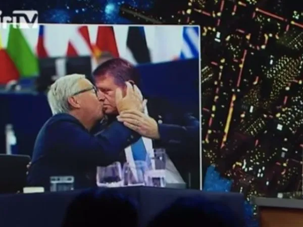 Jean Claude Juncker sărutându-l pe gură pe Klaus Iohannis în stilul celebrului sărut dintre liderul sovietic Leonid Brejnev și omologul său redegist Erich Honecker a fost ilustrația folosită de televiziunea maghiară Hir TV în emisiunea "Bayer Show" pentru a comenta alegerile pentru Parlamentul European, arată Deutsche Welle într-o postare pe Facebook.