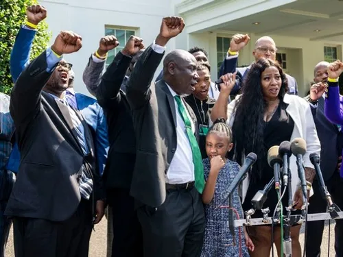 Pentru a încheia această vizită istorică, familia a ridicat pumnul şi a scandat numele lui George Floyd, devenit simbolul victimelor violenţei poliţieneşti din Statele Unite după moartea sa, la 25 mai 2020, la Minneapolis, în cursul arestării sale de către patru poliţişti, relatează Agerpres.