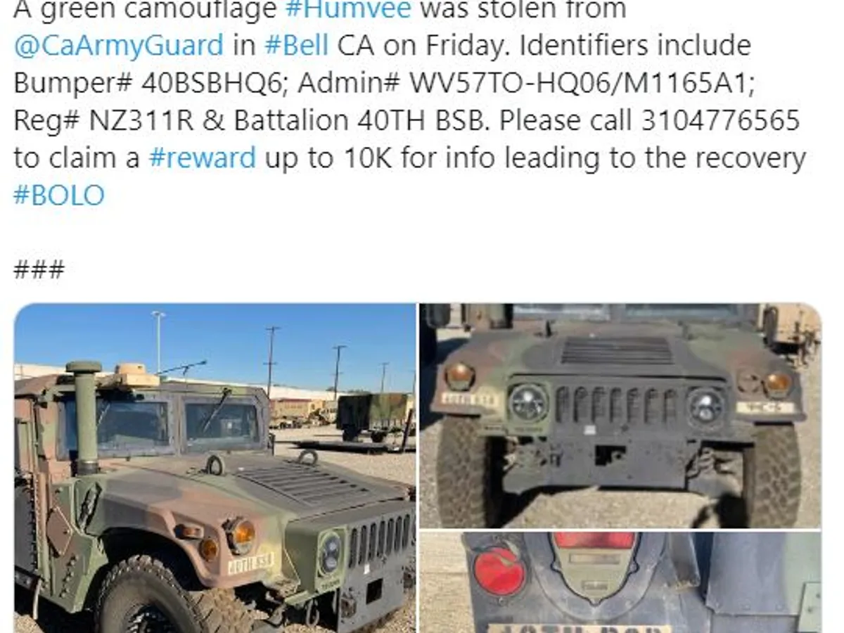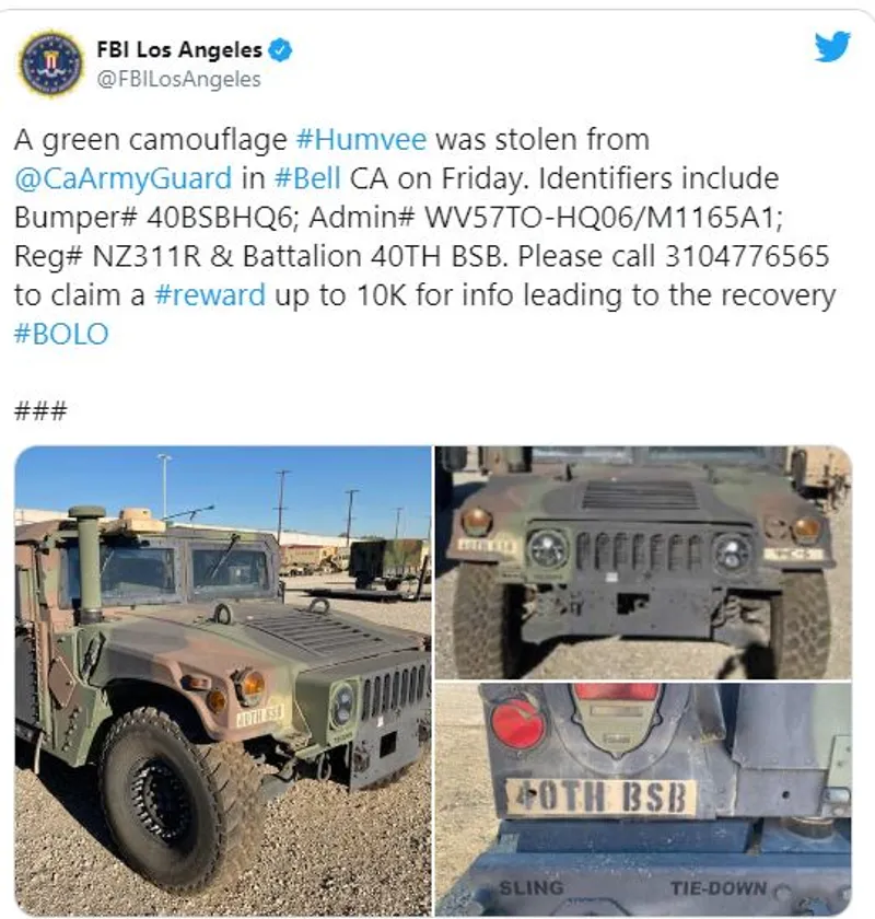 FBI oferă o recompensă de 10.000 $ pentru informații ce vor duce la recuperarea unui Humvee militar furat vineri în Bell.