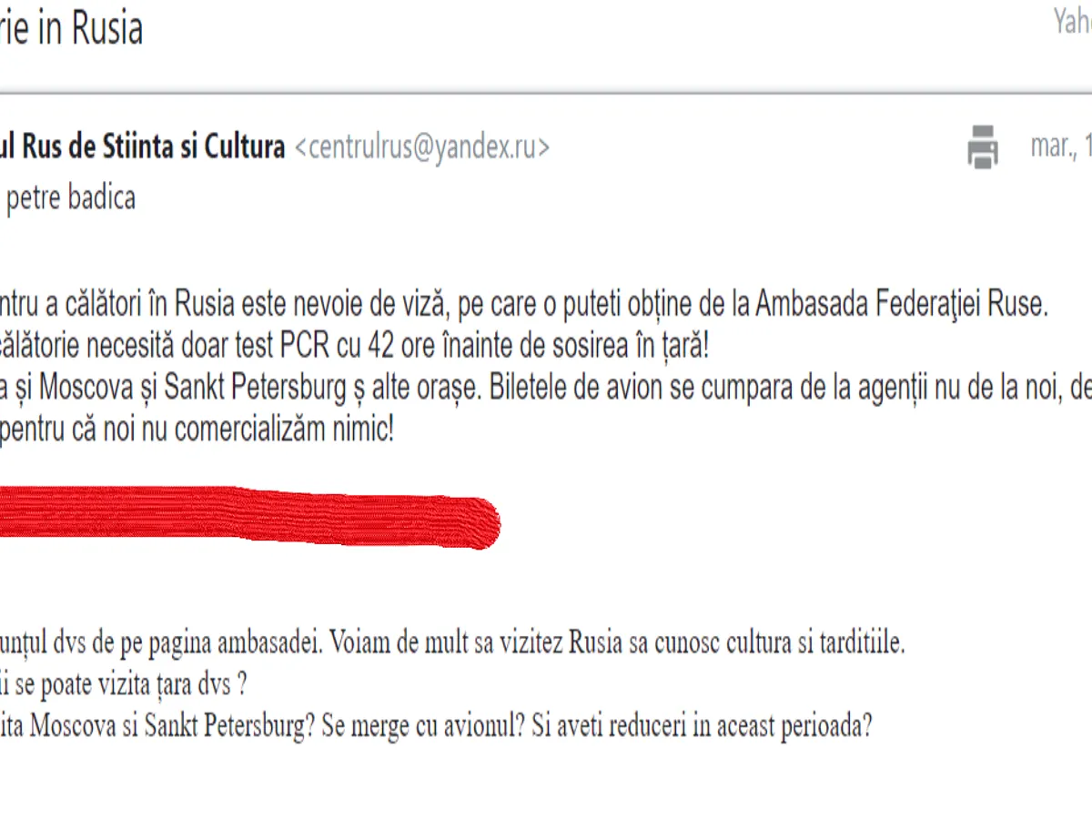 Casa Rusă a răspuns după 3 zile pe mailul personal al redactorului :