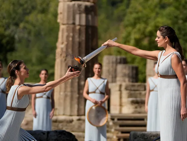 Preşedinta Comitetului Olimpic Internaţional (COI), Kirsty Coventry, aleasă în martie, va participa pentru prima dată la acest ritual în calitate de conducătoare a organizaţiei. Şi, la fel ca înaintea Jocurilor Olimpice de la Paris, actriţa greacă Mary Mina va aprinde torţa, înconjurată de „preotese” îmbrăcate în rochii lungi şi deschise la culoare, inspirate din veşmintele grecilor antici. Torţa va fi apoi înmânată primului alergător, Petros Gaidatzis, medaliat cu bronz la canotaj la Jocurile Olimpice de la Paris, care a considerat selecţia sa „o imensă onoare”.