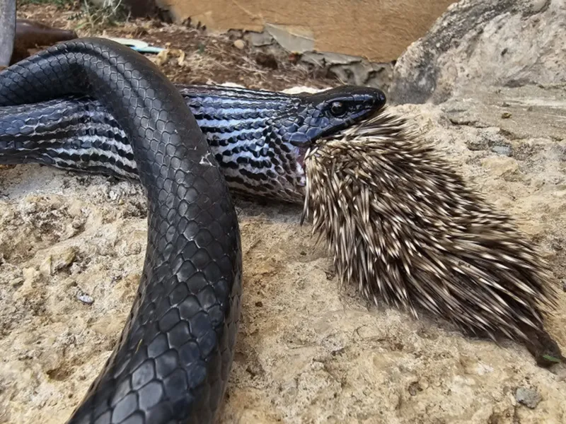 Șarpe negru surprins în timp ce devorează un porc spinos