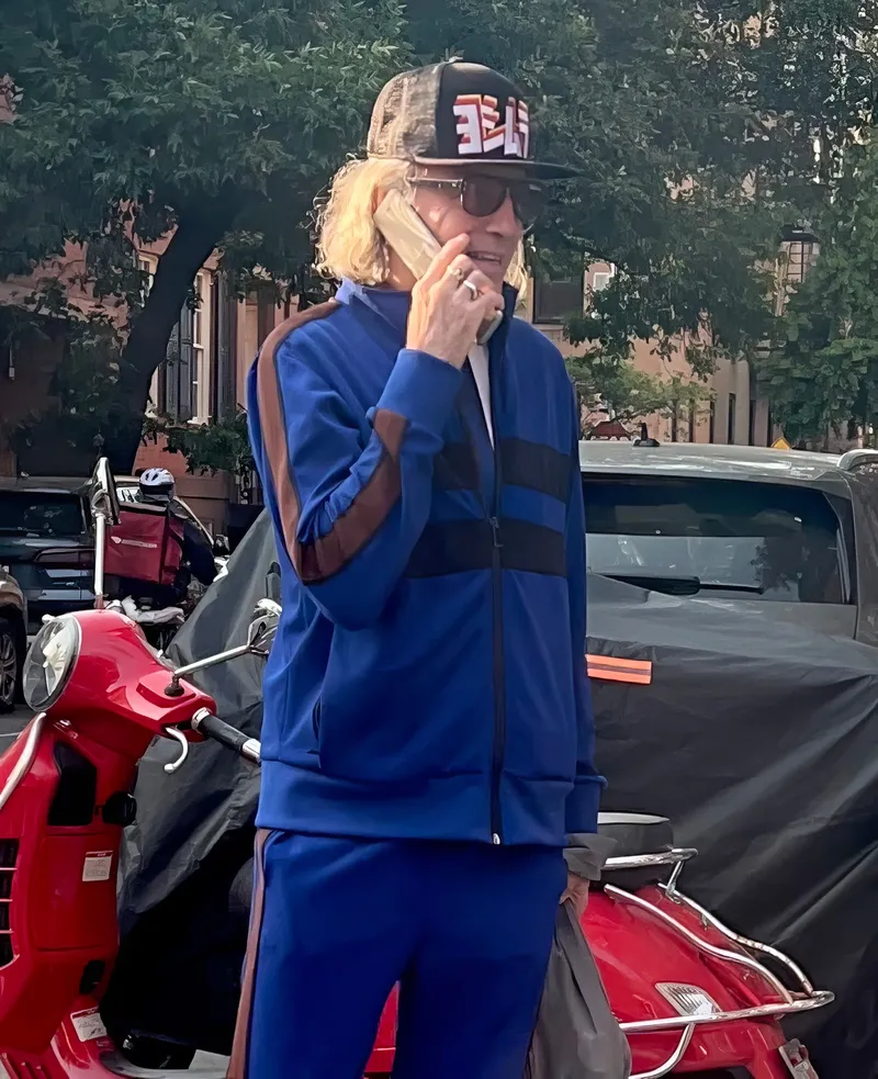 Pe lângă șapca neagră de baseball, Day-Lewis și-a sfidat vârsta îmbrăcat într-un costum de trening negru-albastru.