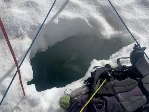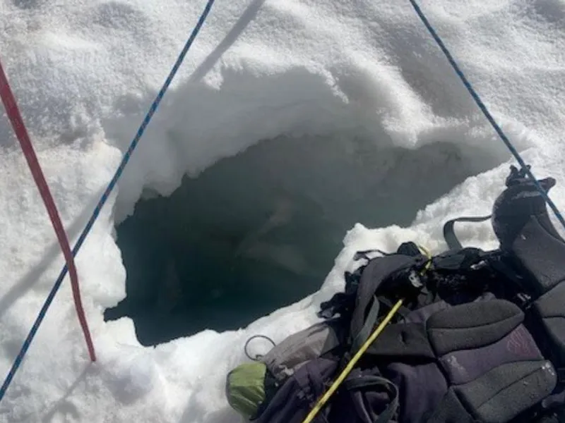 În timp ce traversa gheţarul, ea a căzut într-o crevasă, însă a aterizat pe un pod de gheaţă din fisură.