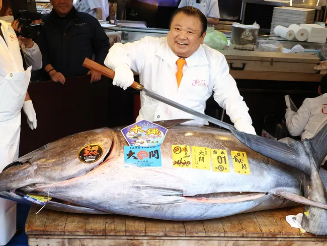 Autoproclamatul „rege al tonului”, Kiyoshi Kimura, al cărui lanţ de restaurante Sushi Zanmai a câştigat licitaţia, a plătit un preţ piperat pentru acest peşte de 243 de kilograme pescuit în largul coastei de nord-est a Japoniei.