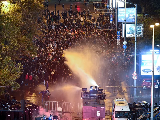 19.00 A început meciul. Fanii au dat foc la câteva coșuri de gunoi și au mărșăluit din nou spre poliție. La intrarea într-un bloc din Gurko, un bărbat este bătut cu brutalitate de poliție. Nu se știe care este starea lui.