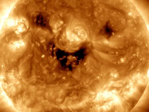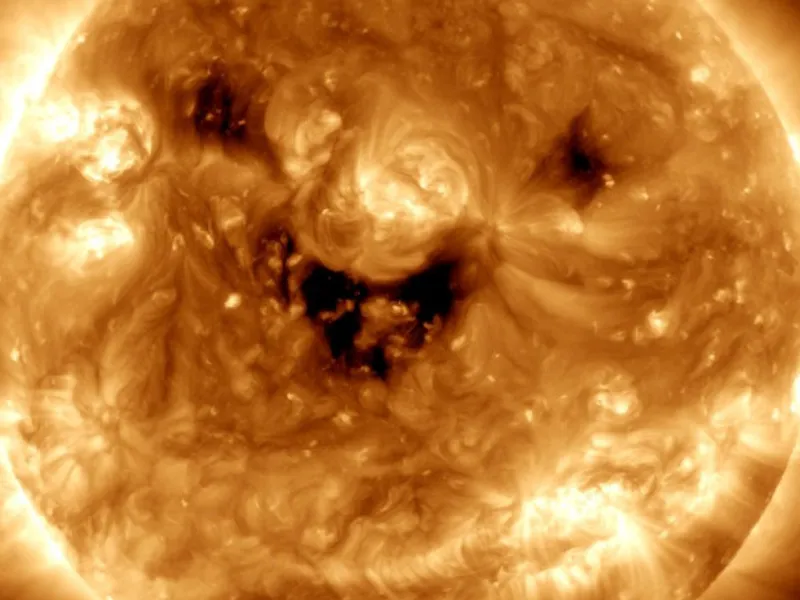 NASA a captat o imagine a Soarelui în care pare că acesta „zâmbește”. Este vorba de fapt despre găuri coronale, locurile unde exploziile rapide de vânt solar țâșnesc în spațiu.