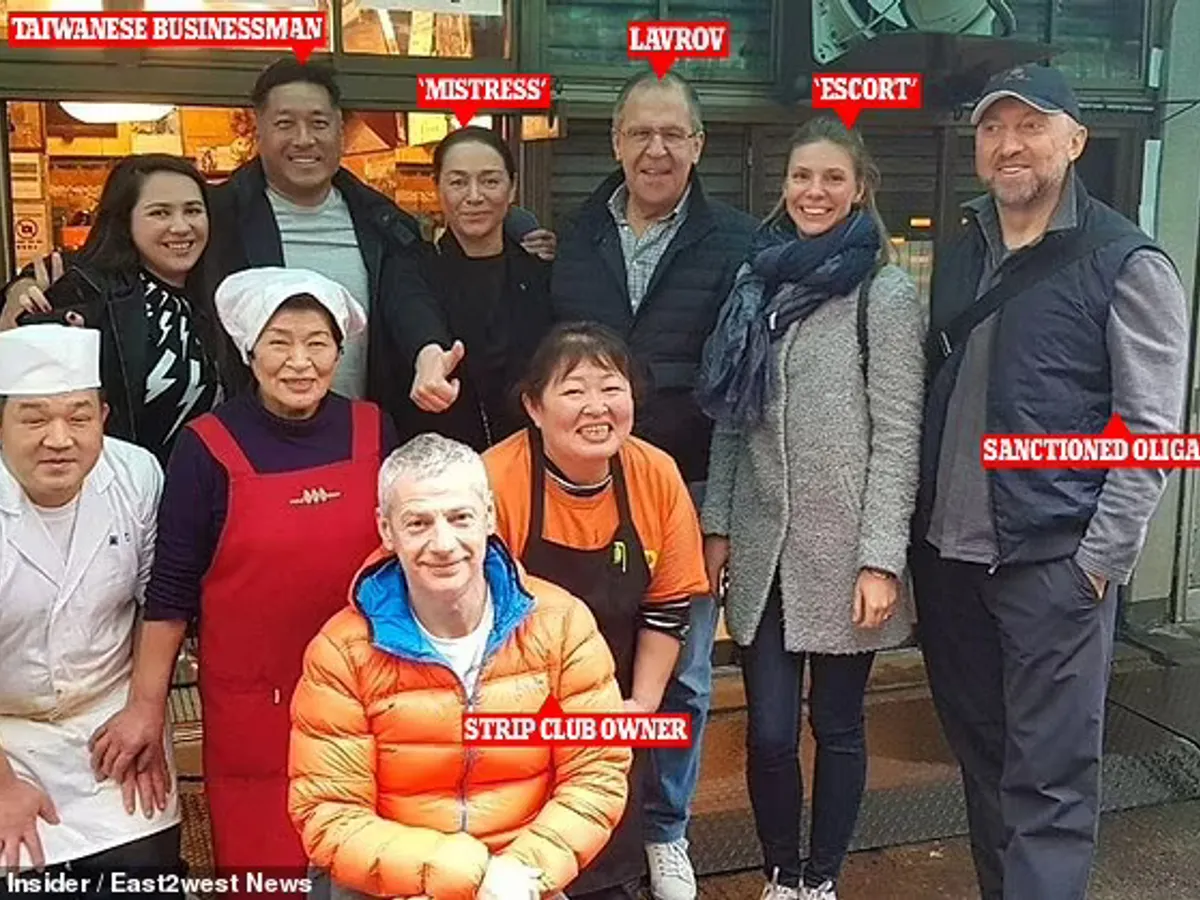 The Insider și New Lines au obținut o fotografie în fața unui restaurant japonez în care apar Serghei Lavrov, amanta lui, Svetlana Poliakova (stânga), Oleg Deripaska, escorta Ekaterina Lobanova (lângă Deripaska), Gennady Rovner (poartă o jachetă portocalie), fost proprietar al unui lanț de localuri striptease și acum președinte al Consiliului de administrație al Fundației pentru Programe Avansate, și Angelo Koo, președinte al Fundației pentru Dezvoltare cu China din Taiwan (rândul de sus, al doilea din stânga). Explicațiile au fost oferite de Daily Mail.