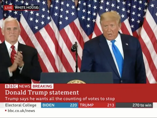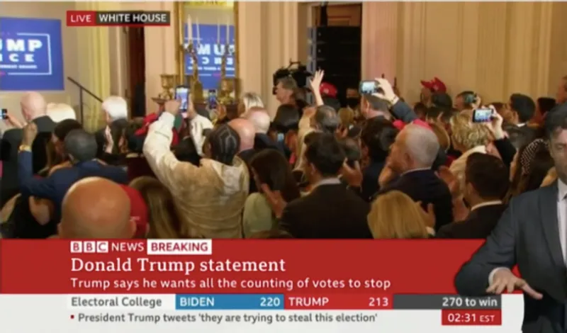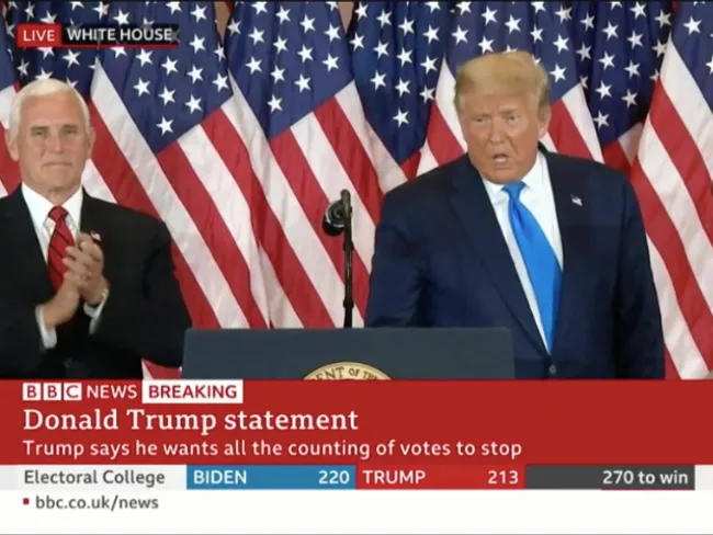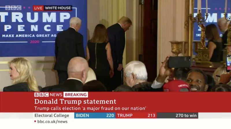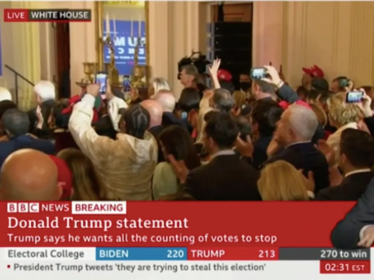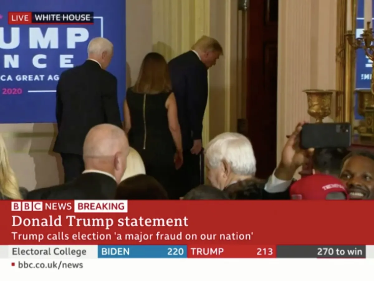 Într-o scurtă intervenție în care a avut-o alături pe prima doamnă, dar și pe vicepreședintele Mike Pence însoțit de consoartă, președintele Donald Trump și-a anunțat victoria în alegeri. În încăpere se aflau zeci de persoane umăr la umăr. Nici o mască nu se putea vedea.