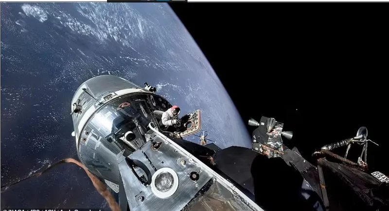 David Scott este văzut în trapa modulului de comandă al navei Apollo 9 în 1969, într-o fotografie realizată de Russell Schweickart, restaurată de Saunders.