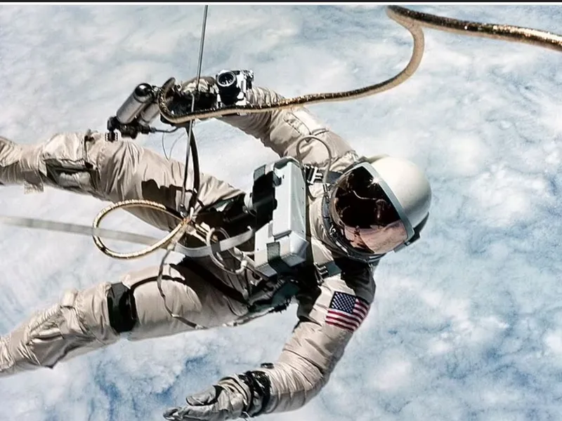 Primul portret al unui alt om în spațiu a fost realizat în 1965, înfățișându-l pe Ed White părăsind aeronava Gemini IV în 1965, realizat de James McDivitt.