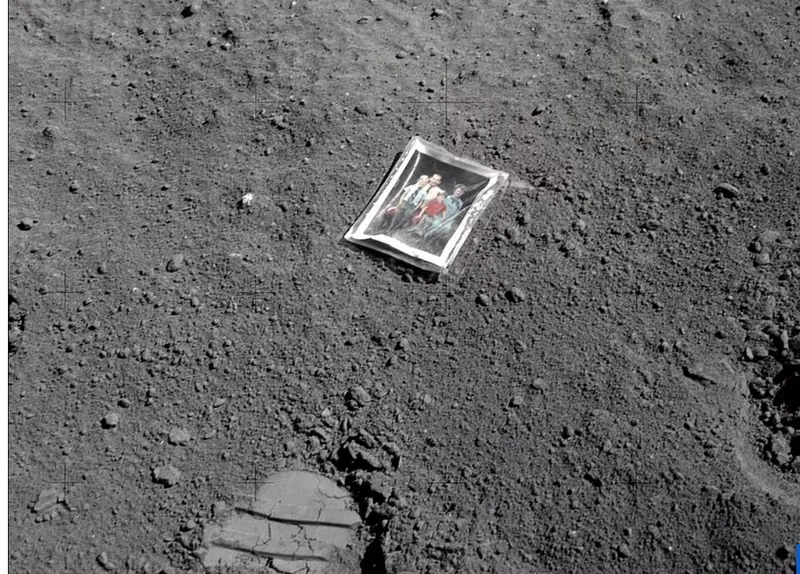 Charles Duke lasă o fotografie a familiei sale pe suprafața Lunii, iar amprenta sa se vede clar în apropiere.