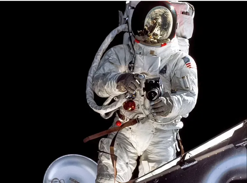 Alte fotografii îl înfățișează pe David Scott, cum se reflectă în vizorul lui Russell Schweickart pe Apollo 9 în timpul misiunii lor de zece zile.