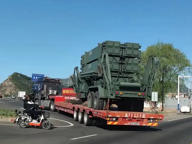 Înfățișează ceea ce pare a fi un lansator de rachete de apărare aeriană tip Patriot, fabricat în Statele Unite, transportat cu un camion, undeva, în China.