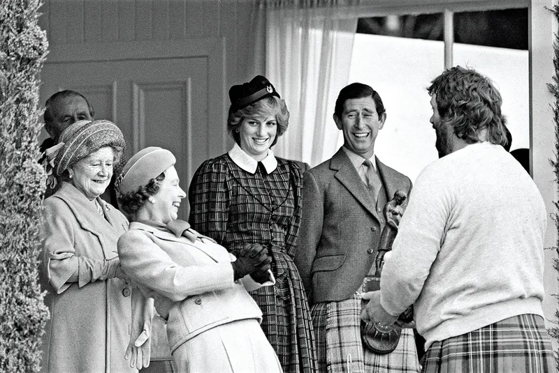 ÎNSUFLEȚIRE Împărtășind un hohot de râs la Braemar Highland Games din Scoția, în 1982. De la stânga la dreapta: Regina Mamă, Regina, Prințesa Diana, Prințul Charles și atletul Geoff Capes.
