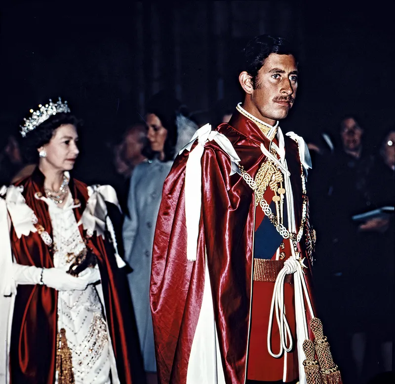 SPRIJIN Regina Elizabeth însoțindu-l pe Prințul Charles, în 1975, la instalarea sa în funcția de Mare Maestru al Most Honourable Order of the Bath, un ordin cavaleresc datând din 1725.