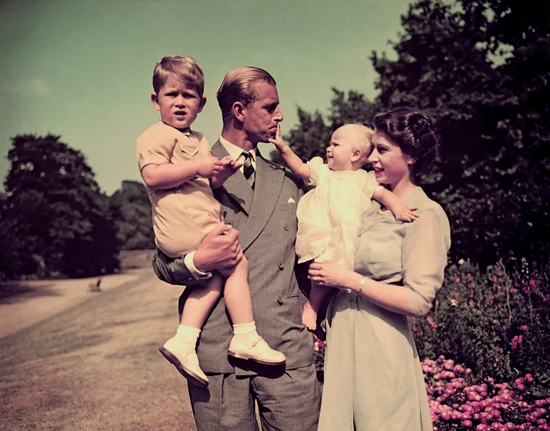 LA DOMICILIU Tânărul cuplu regal, în 1951, cu cel mai mare dintre cei patru copii ai lor, Charles, născut în 1948, și Anne, născută în 1950.