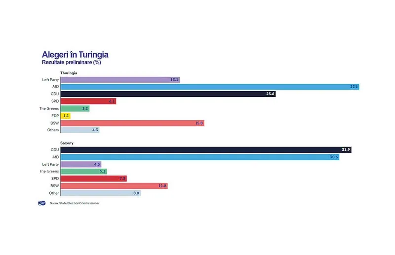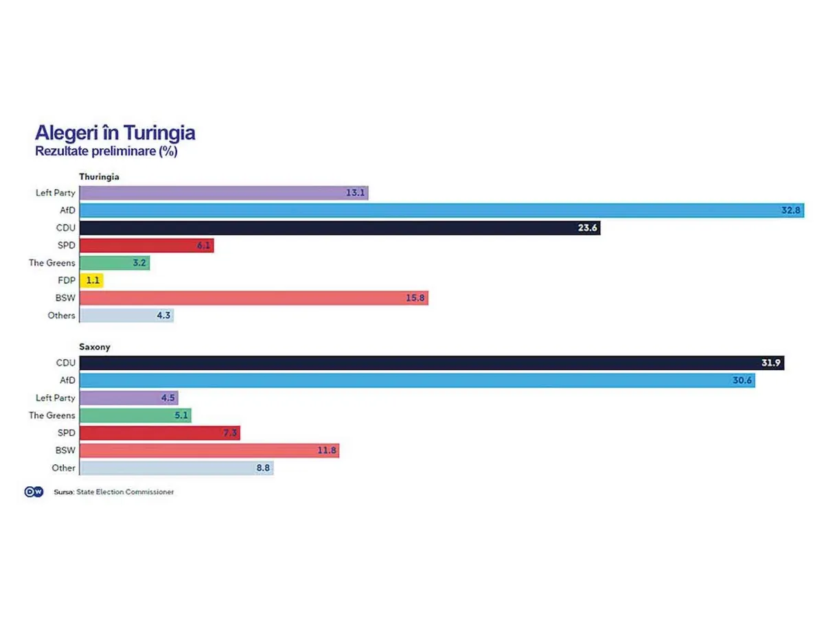 Mai mult, electoratul a votat masiv pentru alte două formațiuni antisistem: Die Linke (foștii comuniști est-germani) și Sarah Wagenknecht (BSW) o formațiune desprinsă din extrema stângă. În landul vecin, Saxonia, AfD s-a clasat pe locul doi, la mică distanță de formațiunea de centru-dreapta CDU.