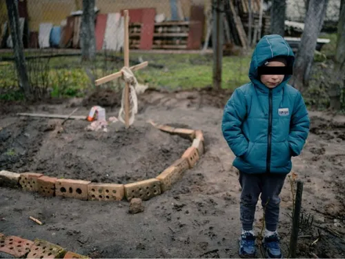 Un copil de numai șase ani este surprins în apropierea mormântului mamei sale. Autorul spune că poza a fost luată în apropiere de Kiev, iar mormântul nu este în cimitir. Este improvizat.