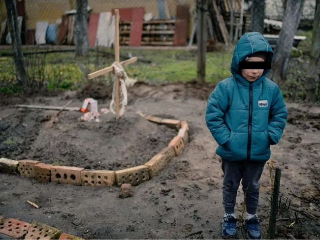 Imagine-simbol a crimelor lui Putin în Ucraina: Un copil de 6 ani așteptă lângă mormântul mamei sale