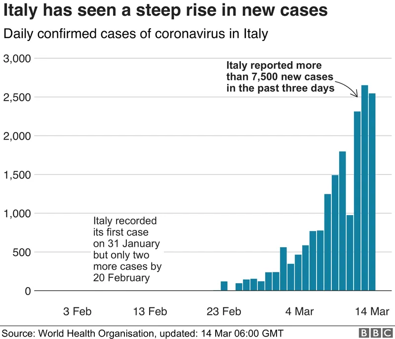 Italia are 17.600 de cazuri confirmate și 1.200 de morți. Cazurile confirmate zilnic în Italia. Italia a înregistrat primul caz în 31 ianuarie 2020.
