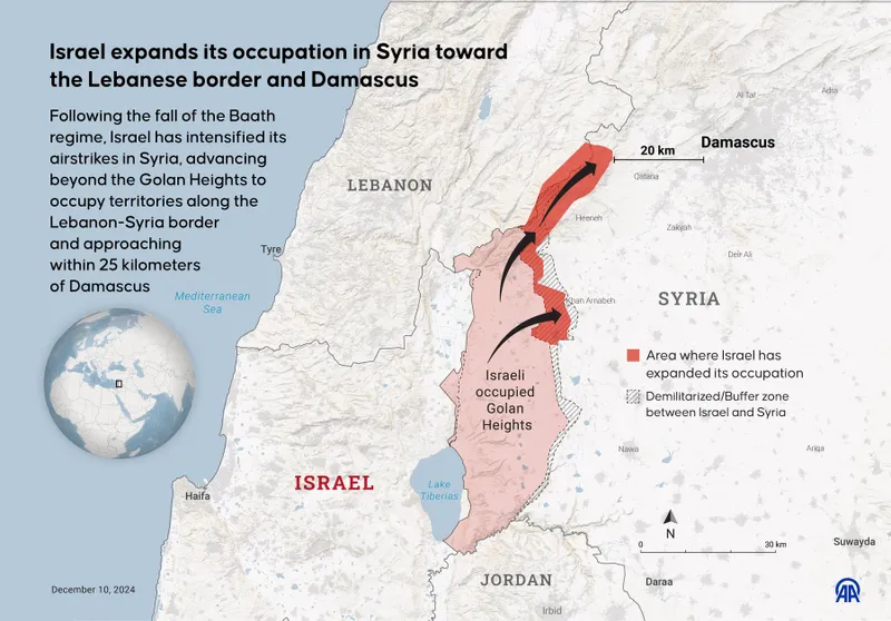 Israelul ocupă cea mai mare parte a Înălțimilor Golan ale Siriei din 1967. În urma prăbușirii regimului lui Bashar al-Assad în decembrie, Israelul a declarat nul acordul de dezangajare din 1974 și a preluat controlul asupra fostei zone demilitarizate.