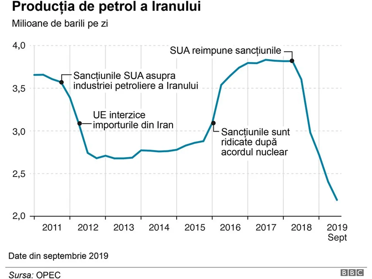 Până în octombrie 2019, producția de petrol a Iranului a scăzut cu 2,1 milioane de barili/zi, potrivit datelor OPEC. Bloomberg a raportat că doar 260.000 barili/zi, în medie, au fost exportați.