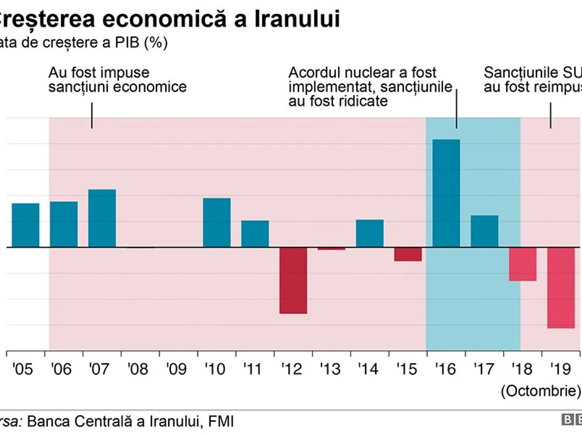 În consecință, PIB-ul s-a contractat cu 4,8% în 2018, iar previziunile sunt că, în 2019, creșterea va fi negativă, - 9,5%, potrivit datelor Fondului Monetar Internațional (FMI). Potrivit predicțiilor FMI, în 2020, creșterea economică a Iranului va fi zero.
