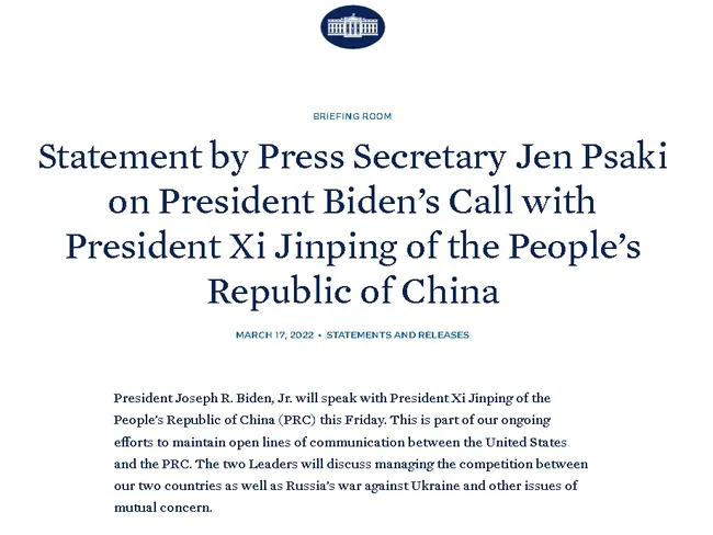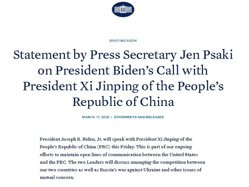 „Preşedintele Joseph R. Biden va vorbi vineri cu preşedintele Republicii Populare Chineze, Xi Jinping. Conversaţia se înscrie în cadrul eforturilor de a menţine deschise canalele de comunicare între Statele Unite şi China", anunţă Casa Albă.