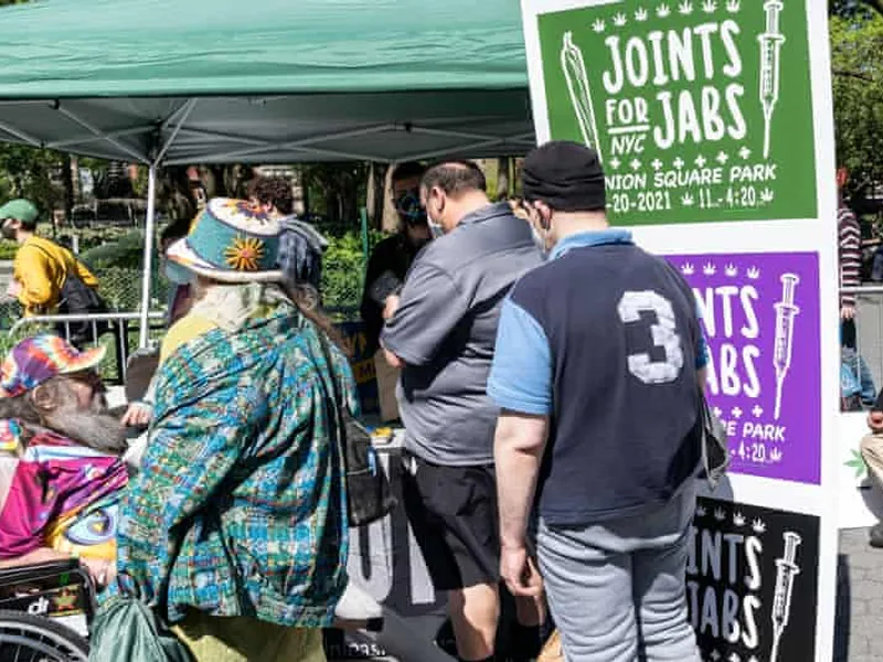 Dacă la „Caravana de la Obor”, un nou centru de vaccinare mobil amplasat în Piața Obor din București, de exemplu, oamenii care se vaccinează primesc o porție de mici cu muștar de la Terasa Obor, în statul american Washington autoritățile oferă „un joint în schimbul vaccinării” (Joints for jabs) oricărei persoane majore, în vârstă de peste 21 de ani, care merge să se vaccineze într-un magazin autorizat să vândă marijuana în scopuri recreative.