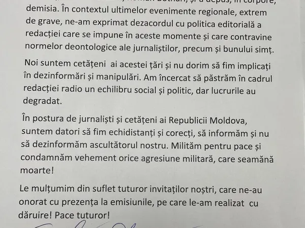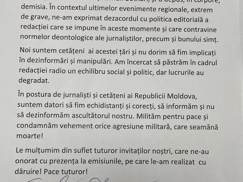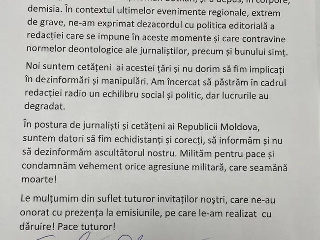 „În contextul ultimelor evenimente regionale, extrem de grave, ne-am exprimat dezacordul cu politica editorială redacției care ne impune în aceste momente și care contravine normelor deontologice ale jurnalismului, precum și bunului simț. Noi suntem cetățenii acestei țări și nu dorim să fim implicați în dezinformări și manipulări. Am încercat să păstrăm în cadrul redacției radio un echilibru social și politic, dar lucrurile au degradat”, afirmă cei opt jurnaliști.