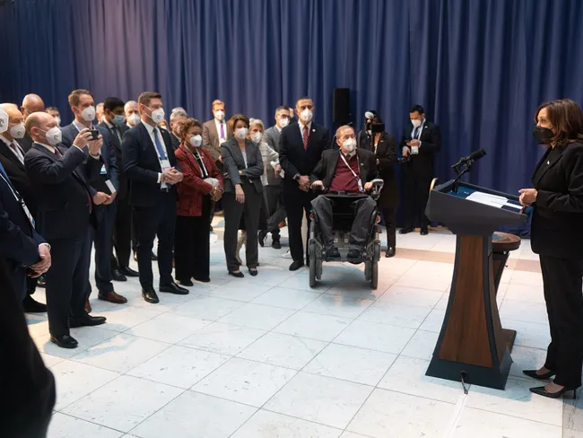 Adesându-se președintelui Vladimir Zelenskiy vicepreședinta SUA a spus că, în cazul în care Rusia va invada Ucraina va face față sancțiunilor economice dure, dar a adăugat că SUA opteaă pentru rezolvarea prin dialog diplomatc a impasului. ”Dacă Rusia vă invadează în continuare țara, așa cum am menționat mai devreme astăzi, vom impune sancțiuni economice rapide și severe. Am spus clar asta. De asemenea, este clar că am prefera ca acest lucru să fie rezolvat într-un mod diplomatic și am rămas deschiși către o cale diplomatică de soluționare”, a mai spus Harris