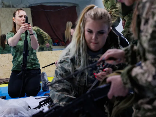 O mulțime de femei, cu manichiură elaborată și îmbrăcate în camuflaj, s-au înscris pentru pregătire militară, în caz că se întâmplă „ceva” cu patria Rusia.