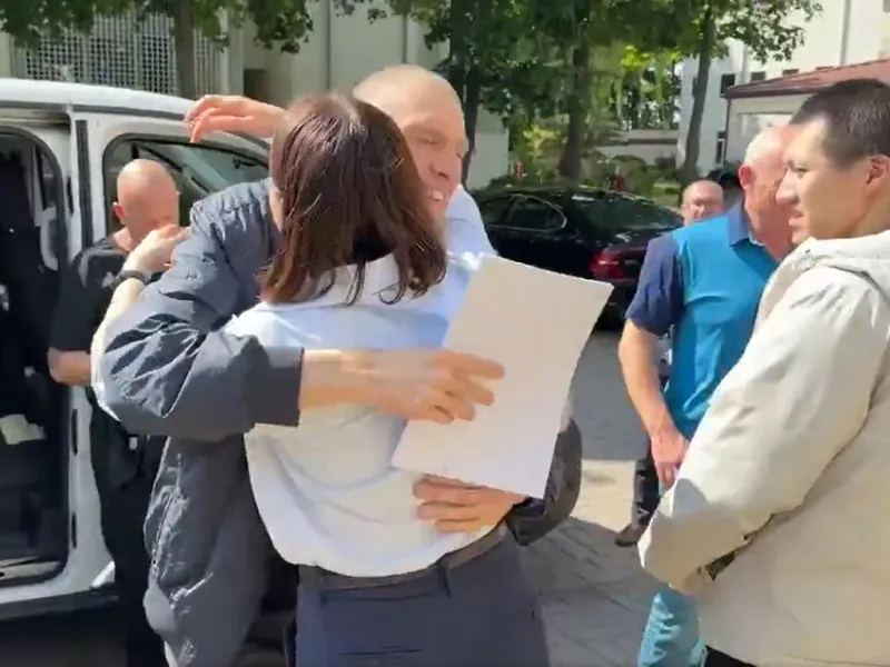 Soția sa, politiciana exilată Svetlana Țihanușkaia, care a preluat cauza opoziției după încarcerarea sa, a distribuit sâmbătă un videoclip în care acesta zâmbea și o îmbrățișa după eliberare.
