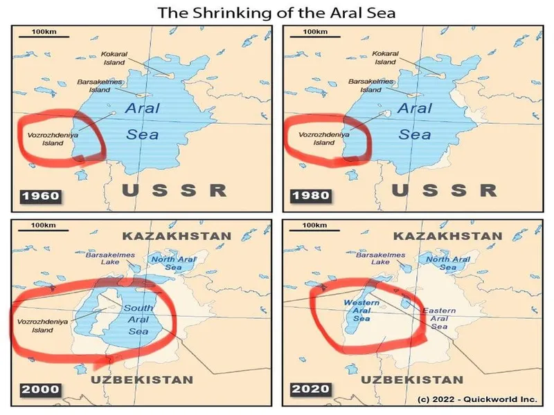 Insula Vozrojdenia, din Marea Aral, este cea pe care Rusia a experimentat antraxul, variola sau ciuma bubonica. Acum, aici este un oraş-fantomă.