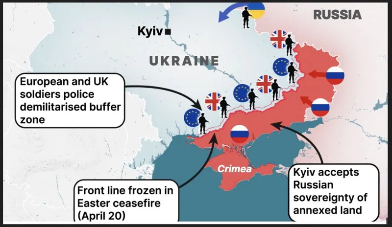 De asemenea, se prevede desfășurarea unui contingent de soldați europeni, care ar putea include trupe britanice, să controleze o zonă demilitarizată. Trupele americane nu vor fi implicate în acest contingent.