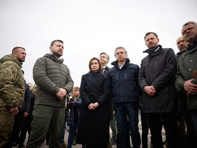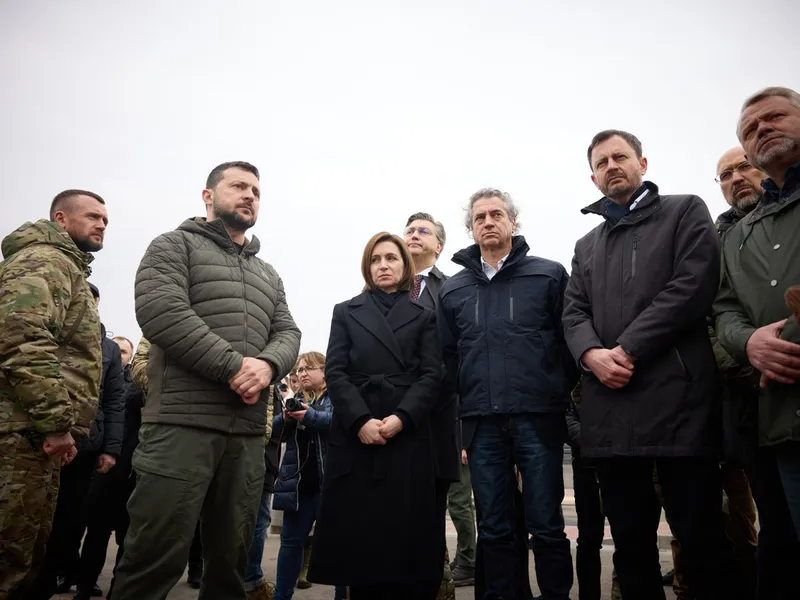 Maia Sandu a fost alături de Zelenski și alți lideri europeni la comemorarea victimelor trupelor rusești din orașul Bucea.