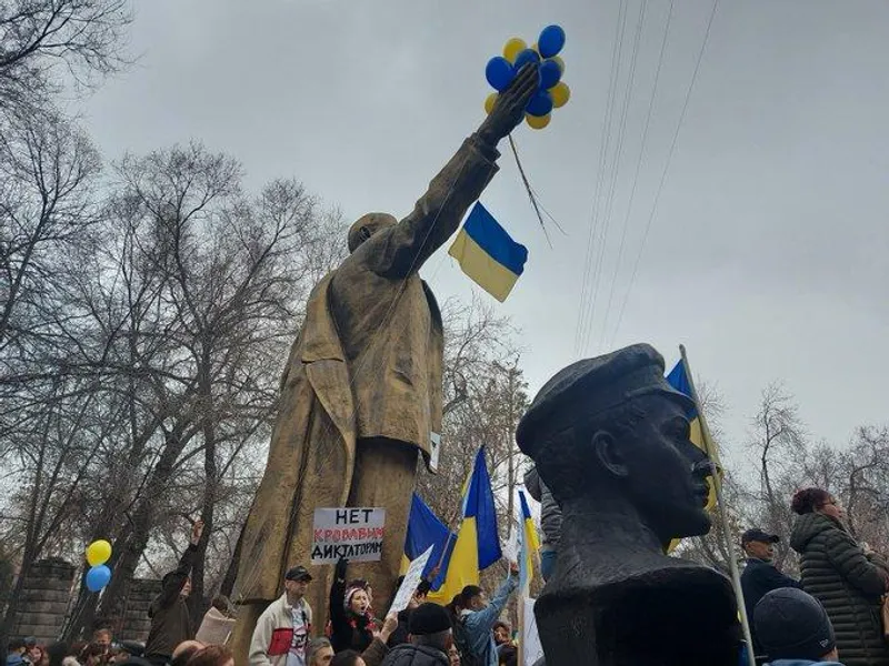 Corespondenta The Economist în Asia Centrală, Joanna Lillis, a publicat pe Twitter mai multe fotografii cu mesajul: Lenin este împodobit cu albastru și galben la un miting împotriva războiului Rusiei din Ucraina.